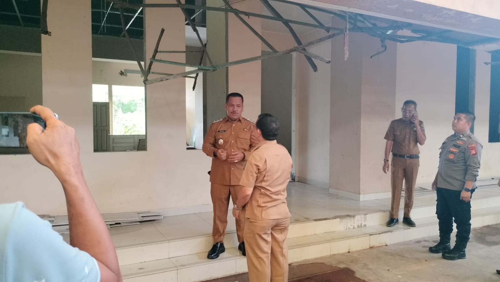 Adapun titik yang ditinjau Orang Nomor Dua di Kabupaten OKI ini yakni Aula/ruang rapat yang mengalami kerusakan plafon akibat diterpa atap bocor, lantai aula digenangi air hujan.